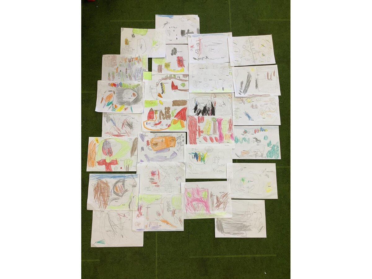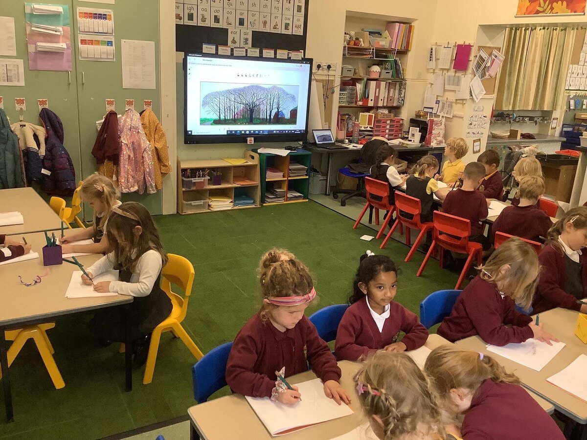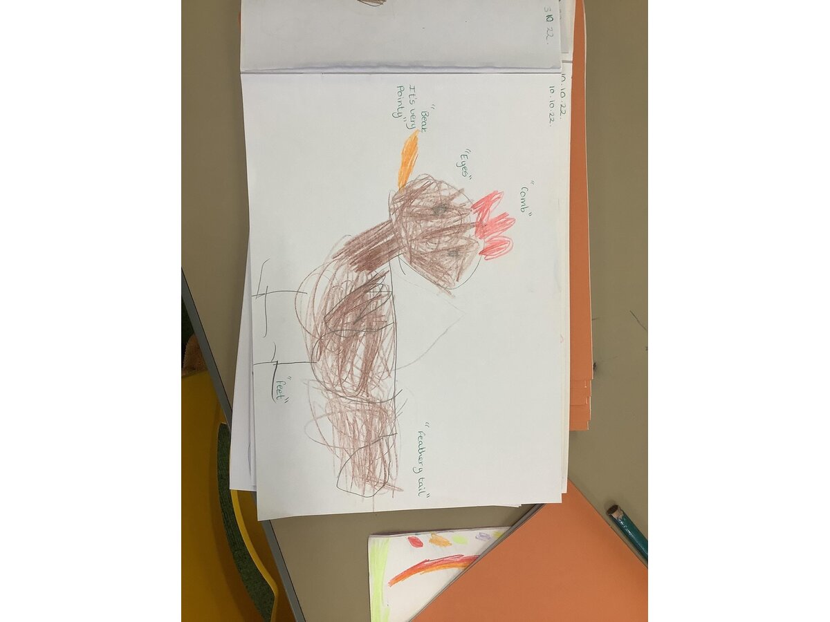 Meanwhile, in Reception, as part of their PE lessons, the children enjoyed ‘balls over the bridge’. At the start of the game, the children were split into two teams; the aim of the game was to get as many balls onto the other side of the bridge as possible but, the children weren’t allowed to move around on their feet! So there was lots of super shuffling from everyone! In Maths, pupils have been exploring the composition of the number 3. They have found different ways to make 3 using the animals on Rosie’s Farm (their current text of study). They generated number sentences using their maths vocabulary of add/plus and equals. The children’s sentences included, “One sheep add one cow and one dog equals three” and "Two sheep add one cow equals three". Also in Maths, the children have been counting chickens back into their coop after they escaped! The children were practising their cutting skills by cutting the chickens out and then had to work out how many chickens they needed using the number that was on their sheet. They were then able to recount their chickens to check they had put the correct number back in and that none had mischievously wandered off... At the start of the week, Reception welcomed a very special visitor.... The children are reading their new book 'Rosie’s Walk' and it seems Rosie walked into Fairfield on Monday! The children were very sensible and kind to their visiting hen, which provided an exciting hook to the book! Later in the afternoon, our Reception pupils had a go at drawing Rosie and then labelling the different parts of a chicken. The children were able to label lots of different parts and have learned some new vocabulary, including: beak, wing, claws, comb and wattle! On Thursday afternoon, the children were looking at aerial views of farms. They spotted and chatted about the different features and then worked very hard drawing their very own. In their Art lesson this week, the children had a go at sketching David Hockney’s 'Bigger Trees Near Water'. They talked about what they could see in the picture and the different things to include in their own drawing. The children worked very hard on this and did a brilliant job!